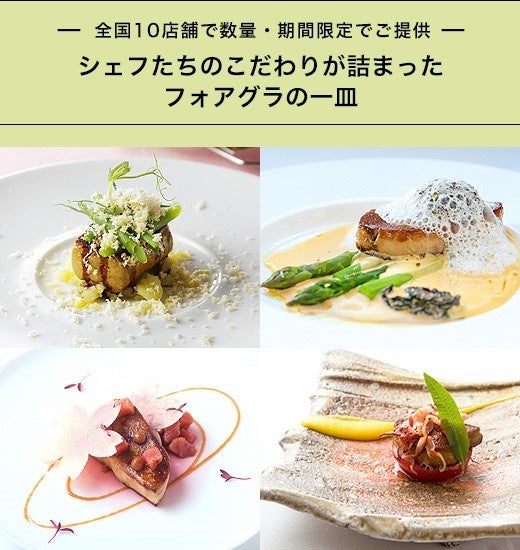 口の中で溶ける濃厚な味わいが魅力のフォアグラを、全国のひらまつのレストランで腕を振るうシェフたちが厳選した食材と合わせ、新しい季節の歓びを感じる一皿に仕上げました。思い思いのスタイルで表現された特別な一皿をぜひお楽しみください。