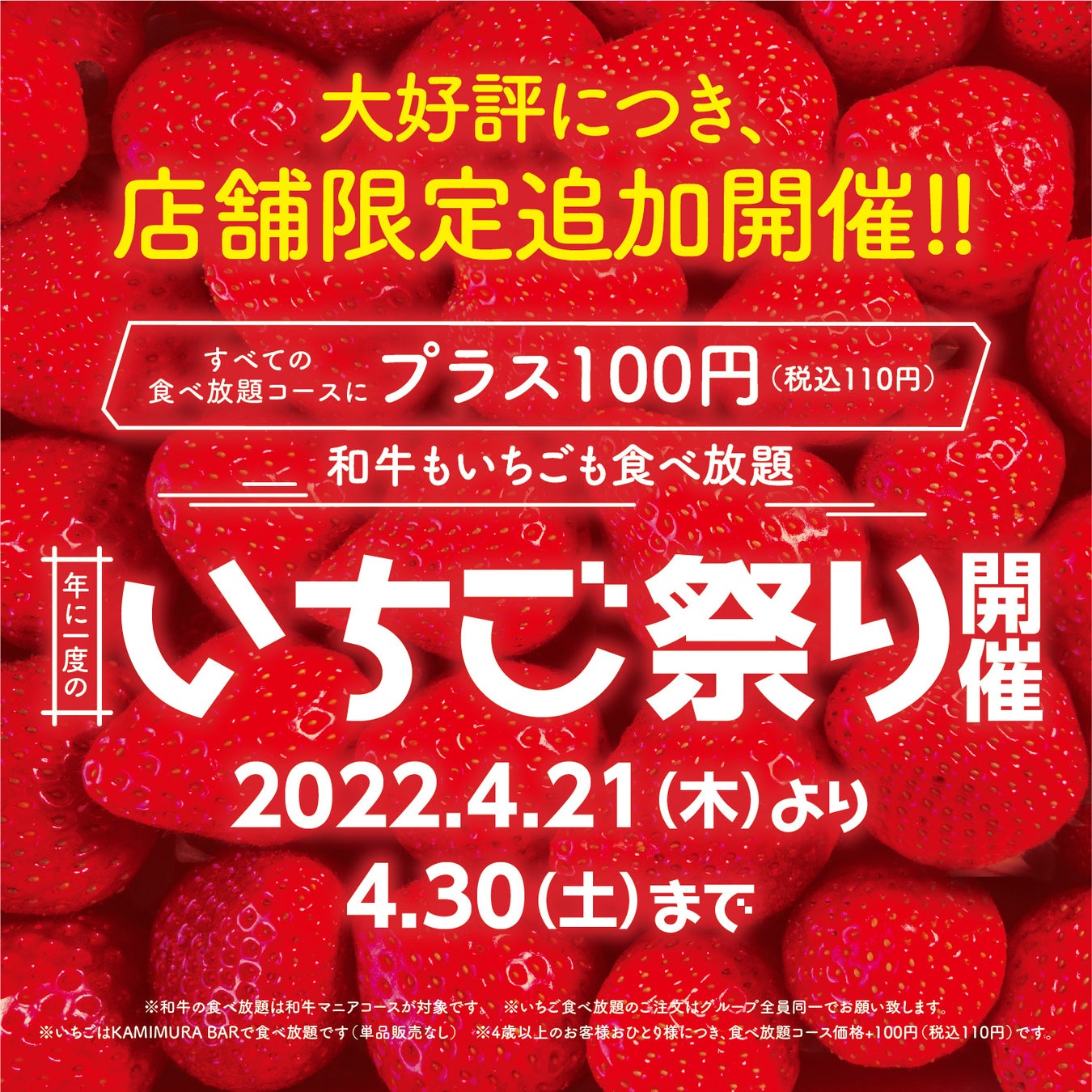 ワタミ株式会社(本社:東京都大田区、以下ワタミ)の展開する幸せの焼肉食べ放題「かみむら牧場」で、2022年4月21日(木)から4月30日(土)までの10日間、今年3月の開催も大好評だった大人気企画「いちご祭り」を名古屋黒川店と八尾高安外環店の2店舗限定で追加開催いたします。