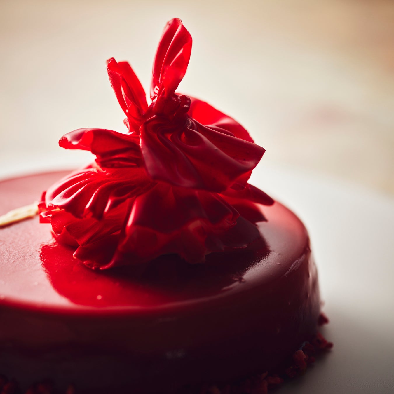 苺&ラズベリーチョコレートのコーティングが艶やかかつ品格のある落ち着いたレッドカラーのケーキにカーネーションの花びらをイメージした繊細で華やかなチョコレートを添えました。