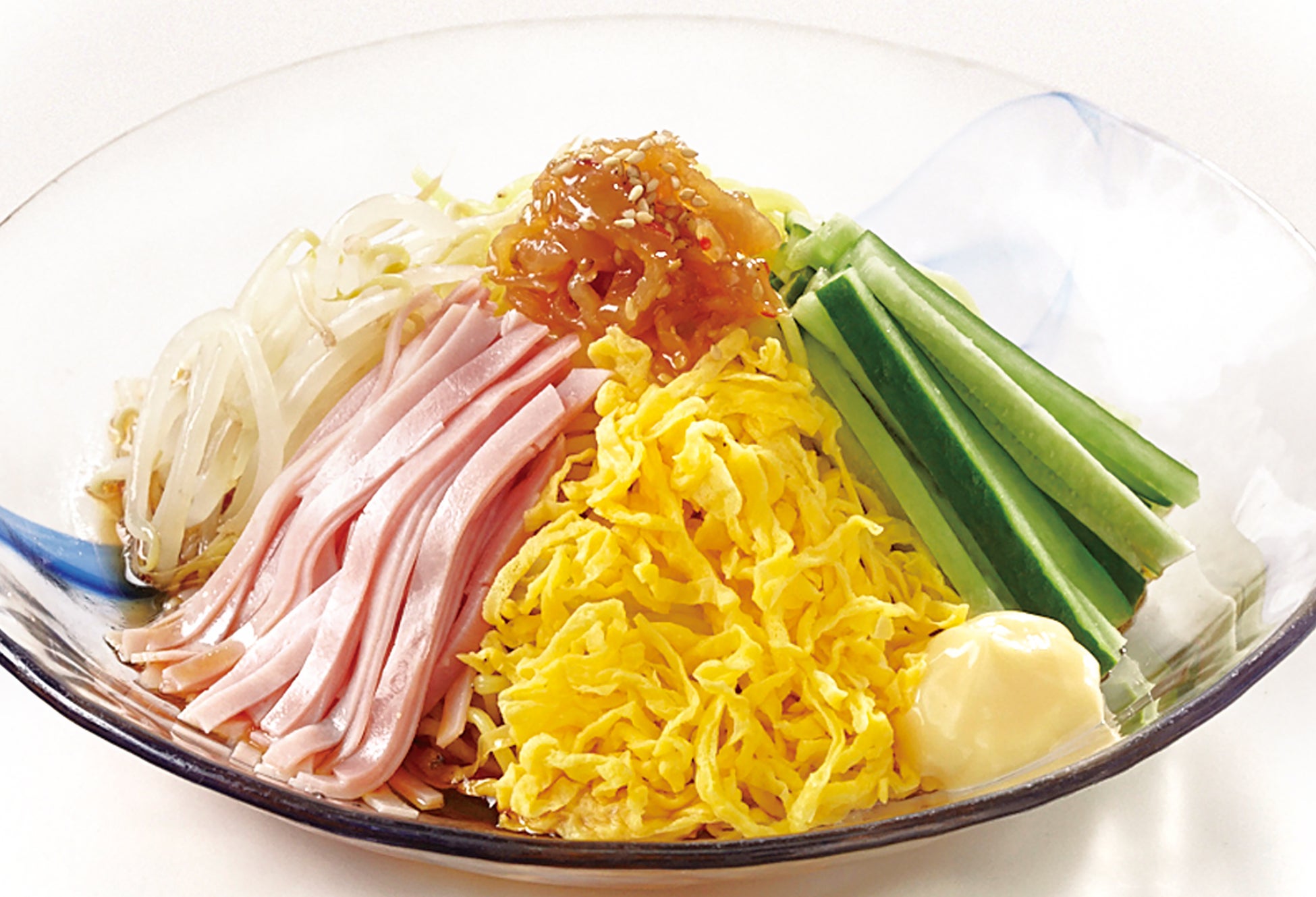 大阪王将の冷やし中華は、王道の醤油味。冷たい麺を飾るのは、きゅうり・錦糸玉子・ロースハム・もやしナムル・中華くらげの5色。彩り豊かでおいしさも広がる『五目冷やし中華』をお楽しみください。
