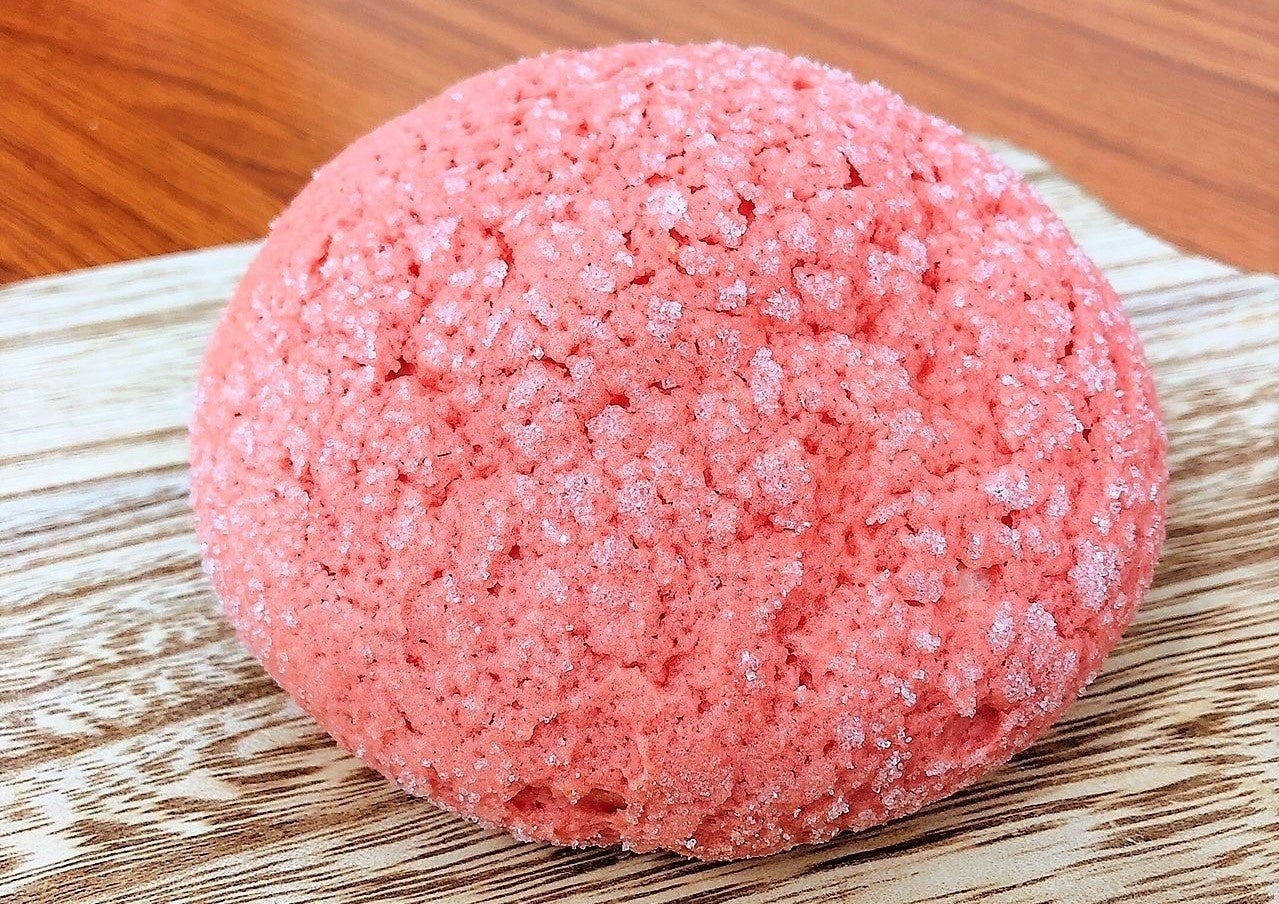 福岡県産あまおう苺ピューレ入りのビス生地を使用した、ほんのり甘酸っぱさがクセになるメロンパンです。