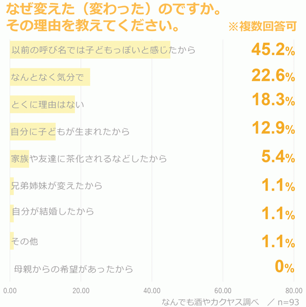 次いで多かったのは「なんとなく気分で」23%、そして「とくに理由はない」18%と続きます。「コレ!」といった明確な理由はないものの、大人になるにつれ、これまでの呼び方が馴染まなくなったり、周囲からの影響もあったりして、「変えてみよう」と思い至ったのでしょうか。「自分に子どもが生まれたから」と回答する人は13%でした。