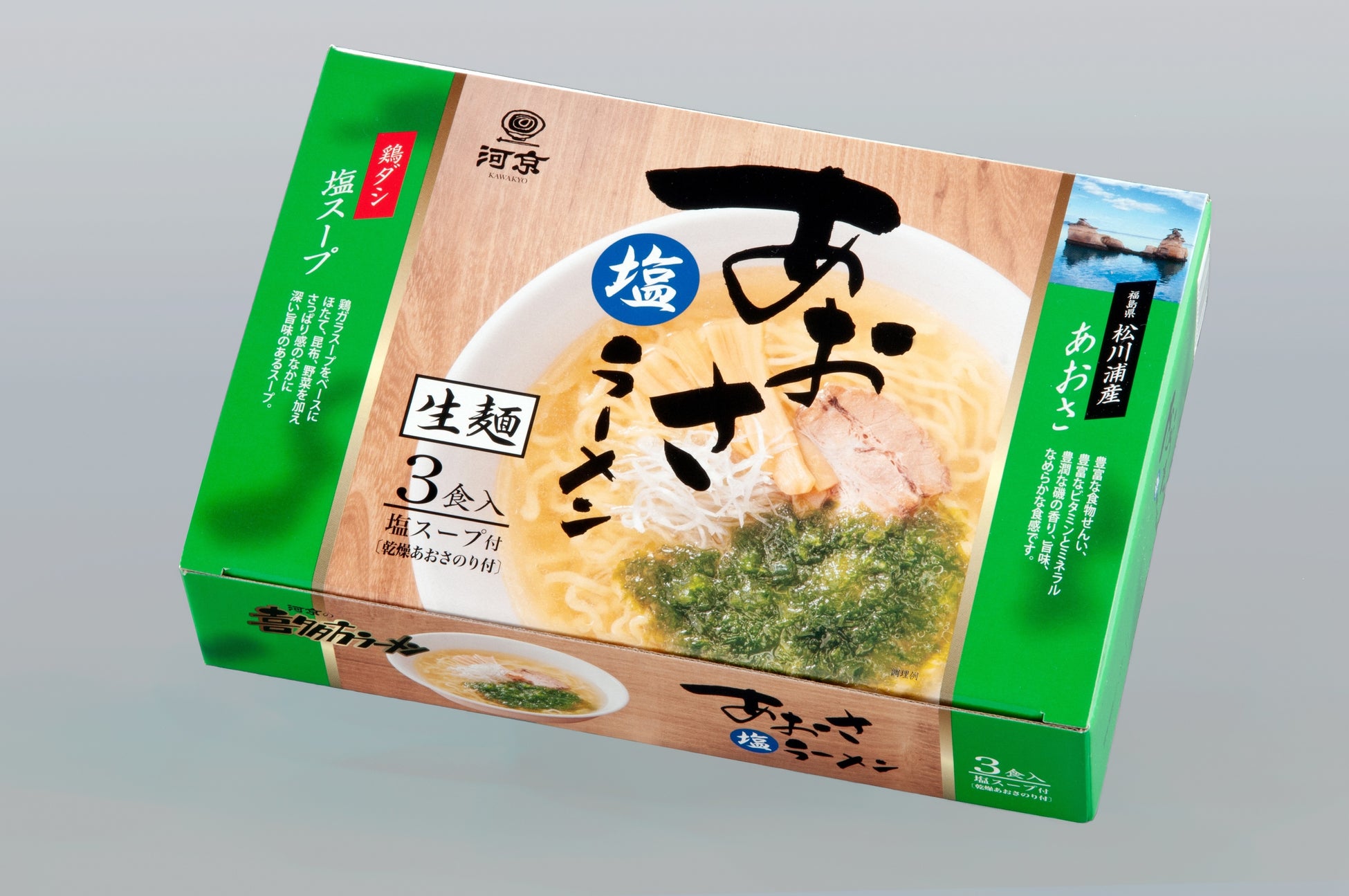 株式会社河京(本社:福島県喜多方市、代表取締役:佐藤富次郎)は、観光土産商品卸しのアイビー株式株式会社(本社:宮城県仙台市、代表取締役:山本拓也)からの企画提案を受け福島県相馬松川浦産のあおさを使用した「あおさ塩ラーメン3食入り」を共同開発。2022年4月1日(金)より発売しました。
