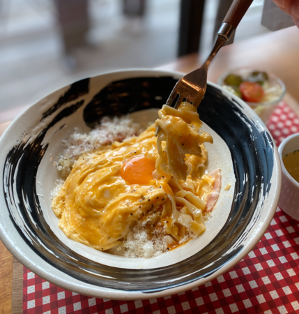カルボナーラ専用の超もちもち“生”パスタでつくるこだわりのカルボナーラを提供。麺は、真空製麺機で仕上げた平打ち生麺を使用する。ソースには、こだわりの北海道根釧地区の濃厚な生クリームを使用。