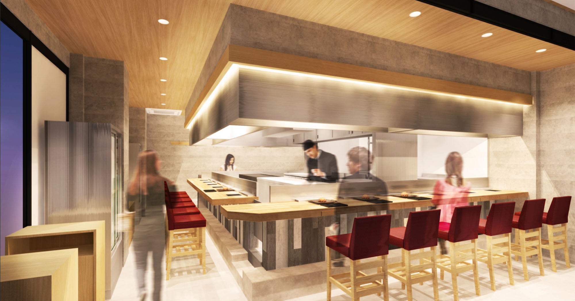 各卓に鉄板を配置しており、それぞれが焼肉スタイルでハンバーグを楽しめるエンターテイメント空間。調理場を囲むコの字型のカウンター席で、臨場感を味わいながら出来立ての料理をご堪能いただけます。