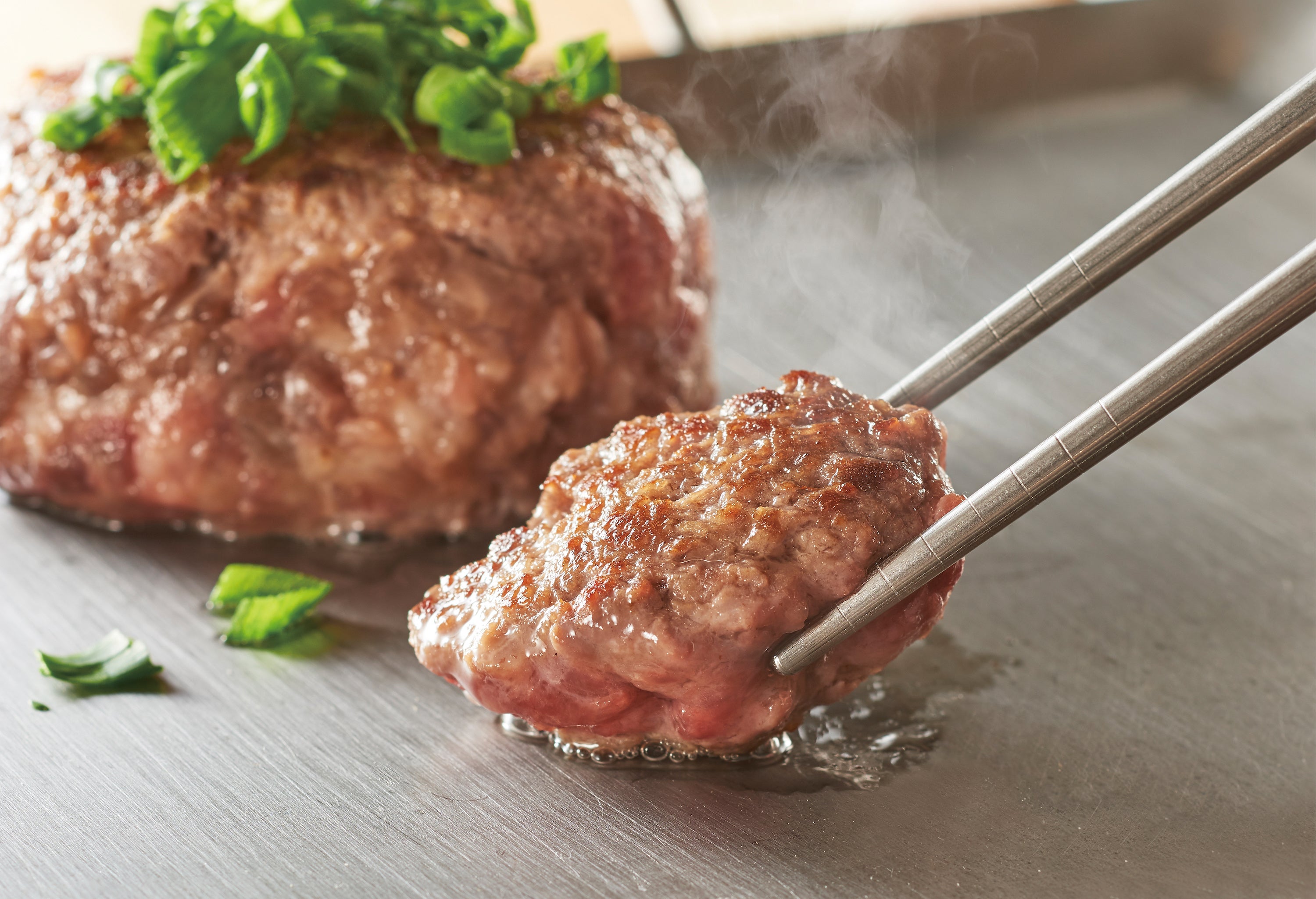 今回新たにオープンする「花より、ハンバーグ。」は、食肉の製造販売を50年あまり手掛けてきた”肉の総合商社”が本気で開発したハンバーグ専門店。肉の総合商社ならではの強みを活かし、流通や安定供給の難しい和牛100%を使用した最高品質のハンバーグをご提供いたします。