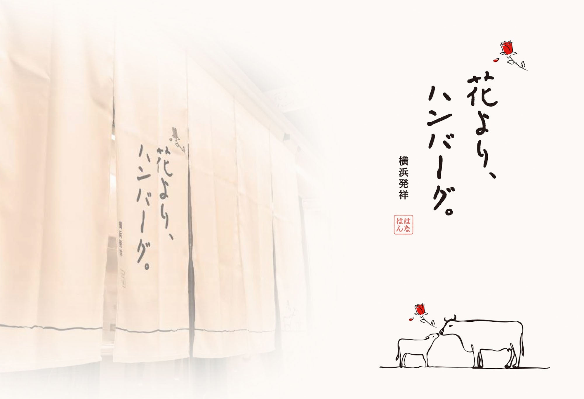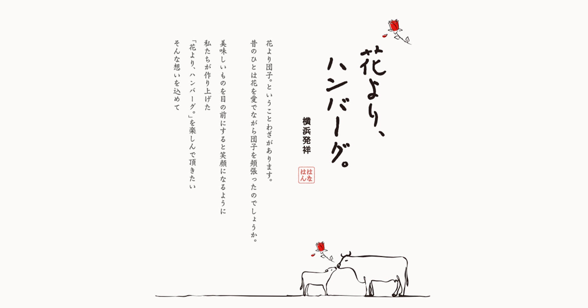 美味しいものを目の前にすると笑顔になるように、私たちが作り上げた 「花より、ハンバーグ。」を楽しんで頂きたい。そんな想いを込めて。