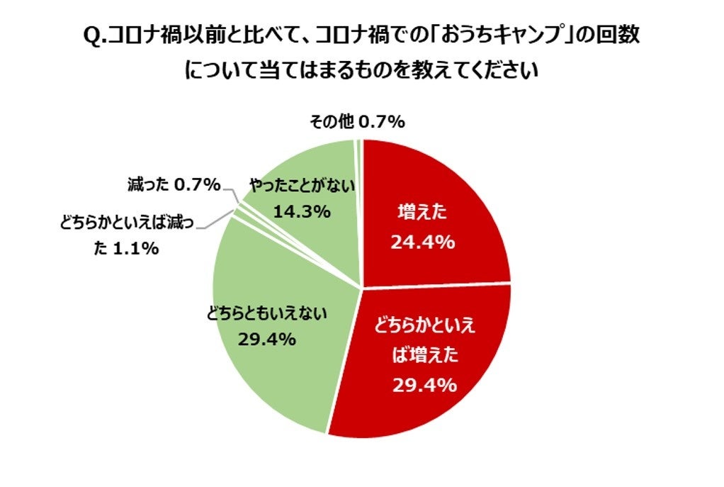 「コロナ禍以前と比べて、コロナ禍でのおうちキャンプの回数」を聞くと、「増えた」が24.4%、「どちらかといえば増えた」が29.4%と、2人に1人が「おうちキャンプ」を楽しんでいることが分かりました。2020年の調査でも同じ結果が出ており、2020年に続いて、キャンプはインドアでも楽しめるレジャーとして根付いてきていると言えそうです。