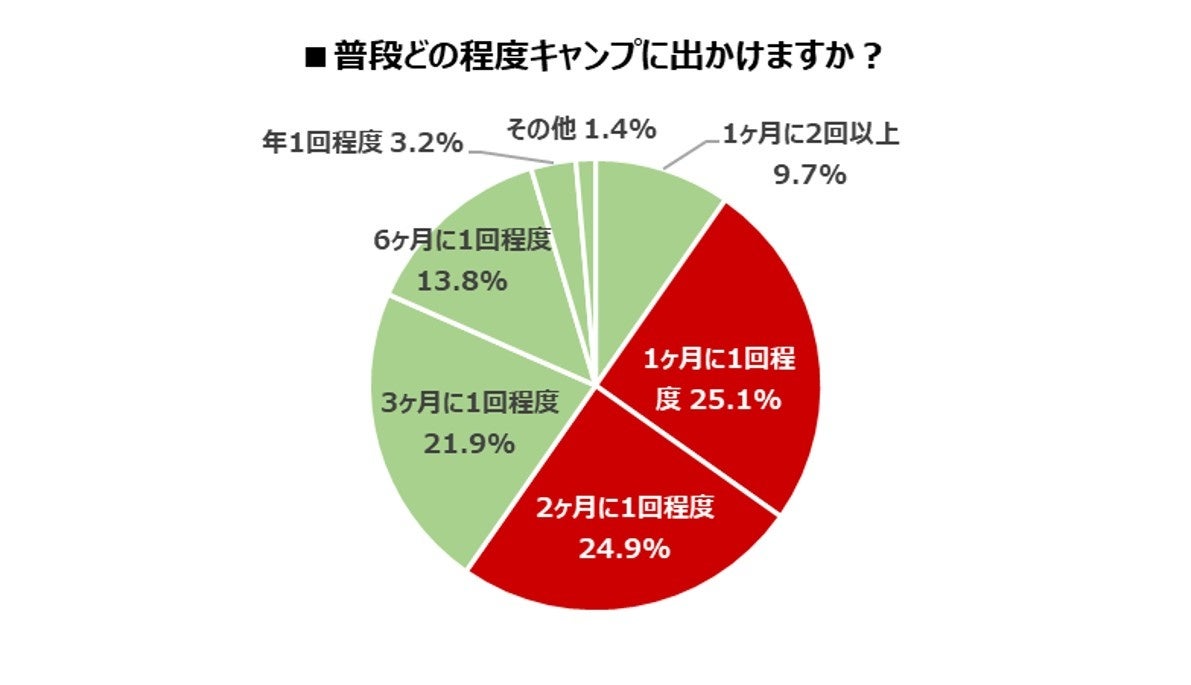 また、「コロナ禍以前と比べて、コロナ禍でのキャンプへ出かける回数」について質問したところ、40%以上の人がコロナ禍でキャンプに行く回数が「増えた」と回答し、「減った」と回答した人を大きく上回る結果となりました。「普段どの程度キャンプに出かけるか」というキャンプの頻度に関する質問では、「月1回程度(年12回程度)」と回答した人が25.1%と最も多く、次に「2ヶ月に1回(年6回程度)」という回答が24.9%と続き、約2人に1人が、年に6~12回程度キャンプを楽しんでいることが明らかになりました。