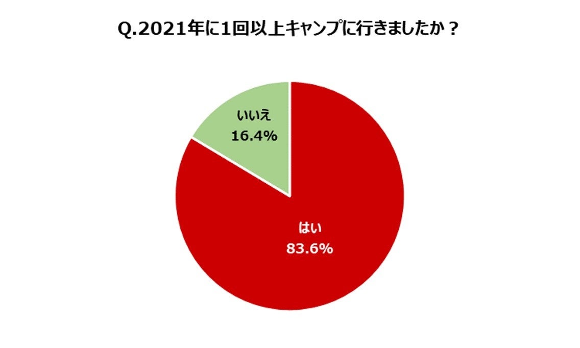 今回対象の529人に「2021年に1回以上キャンプに行ったか」を聞くと、「はい」が83.6%、「いいえ」が16.4%となり、多くの人が2021年にキャンプを楽しんだことがわかりました。以降の設問では、「はい」と回答した442人を対象に質問し、一部設問のみ「いいえ」と回答した87人を対象に質問しています。