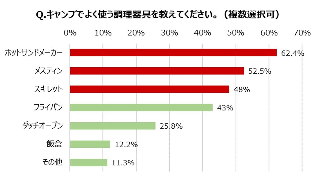 キャンプを始めるとたくさん揃えたくなるのがキャンプ道具。その中でもキャンプに欠かせない「食」に関わるアウトドア調理器具も、様々なメーカーから多くの種類が発売されています。「よく使う調理器具」を聞いたところ、1位が「ホットサンドメーカー」で62.4%、2位が「メスティン」で52.5%、3位が「スキレット」で48%となりました。この3つがキャンパーによく使われる人気調理器具、「三種の神器」と言えそうです。