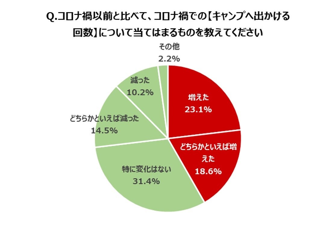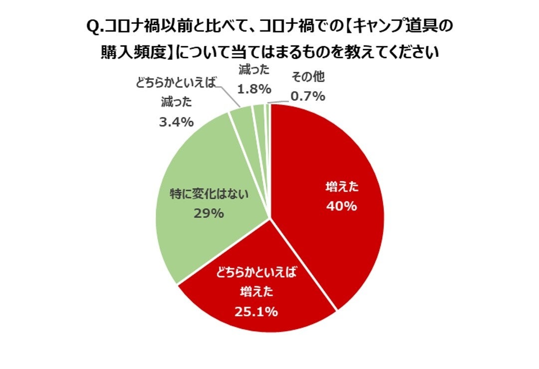 「コロナ禍以前と比べて、コロナ禍でのキャンプ道具の購入頻度」について聞くと、40%が「増えた」、25.1%が「どちらかといえば増えた」と回答し、計65%以上もの人の購入頻度が増えていることが分かりました。一方で「減った」と回答した人はたったの5.2%ととても低い結果となりました。コロナ禍でキャンプを始めた人が多いことや、キャンプ頻度が高まったことによる影響が大きいと思われ、現在、キャンプ市場における消費が非常に活発な傾向にあると言えます。