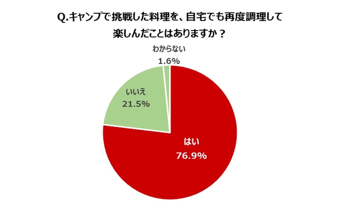 「キャンプで挑戦した料理を、自宅でも再度調理して楽しんだことはあるか」という質問には、80%近くの人が「はい」と回答しました。非日常から日常の楽しみとして、キャンプでの「食」を自宅でも体験したいという人が増えていることが分かり、「キャンプ飯の内食化」が進んでいると言えます。