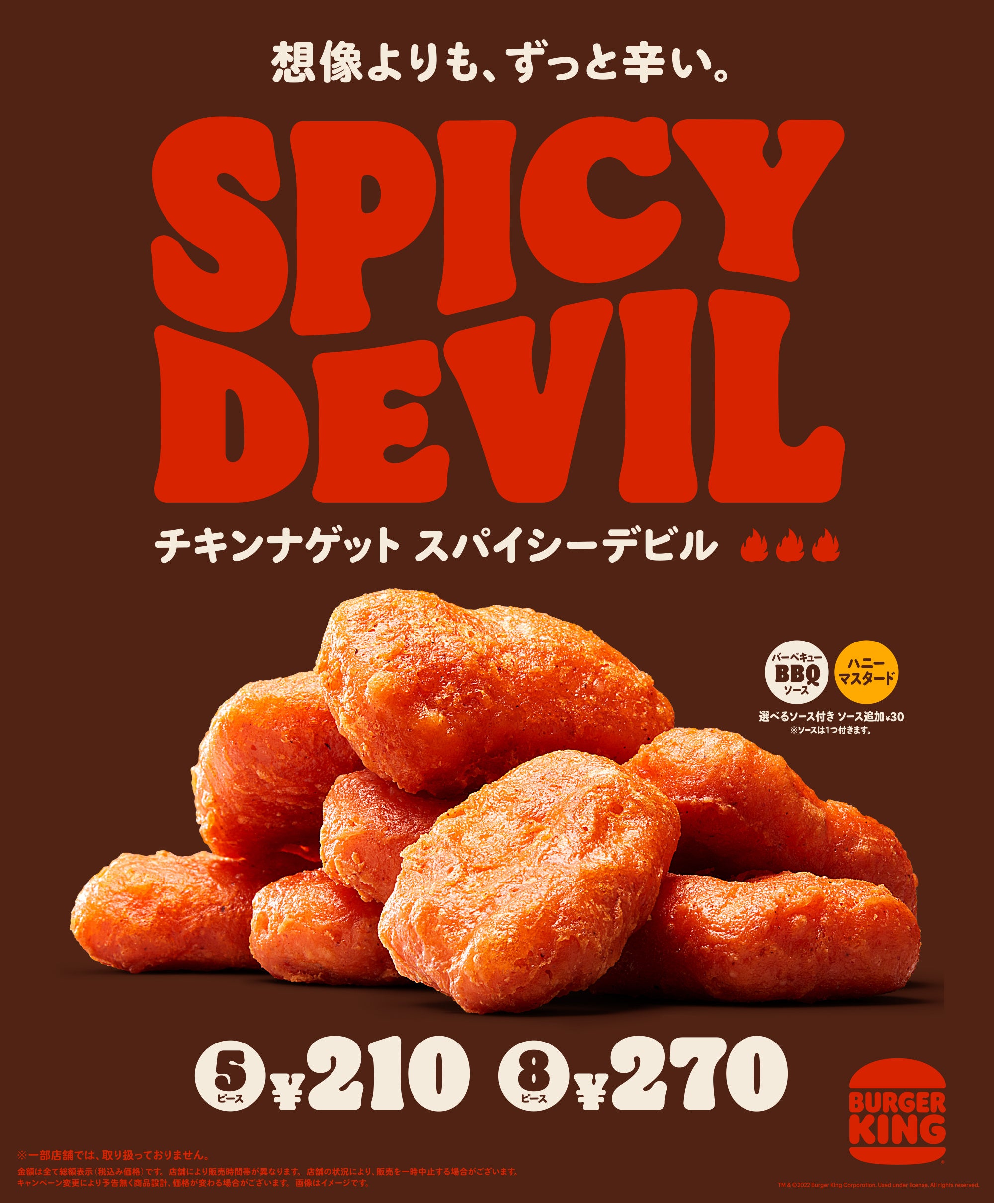 バーガーキング® の『チキンナゲット スパイシーデビル』は、ジューシーな鶏むね肉に、バーガーキング® 独自配合のチリパウダー、ペッパー、パプリカなどのスパイスを使用した、あとをひく辛さが刺激的なチキンナゲットです。ソースはコク深く渋みのあるスモーキーな味わいの「BBQソース」、やさしい甘さと酸味が特徴の「ハニーマスタードソース」の2種類から1つをお選びいただけます。
