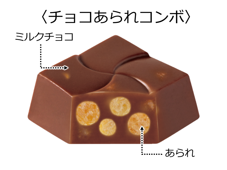 中のチョコは、ミルクチョコの中にあられを入れた“甘い×しょっぱい”が楽しめる組み合わせ。ザクザク食感がアクセントになっています。