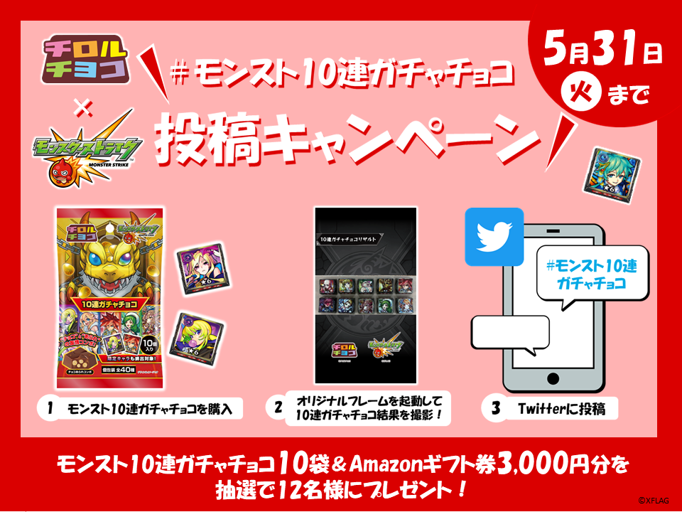 オリジナルカメラフレームで撮影した画像を投稿すると、「モンスト10連ガチャチョコ」×10袋&アマゾンギフト券3,000円分が12名様に当たる!