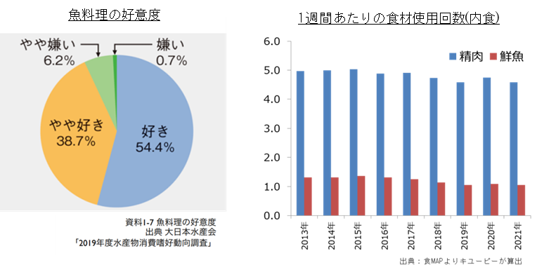 キユーピーが『旬のやさかなレシピ』推進プロジェクトを始動する背景には、日本における魚の生産量や購入量の減少があります。魚料理への好意度は高い一方(以下、左グラフ)、内食における1週間あたりの食材使用回数の調査によると、肉は週に4~5回使用されているのに対し、魚は週に1回しか食卓に上っていないという現実がうかがえます(以下、右グラフ参照)。