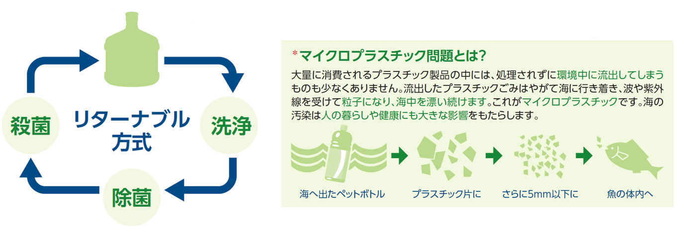 「おいしい⽔の宅配便」のボトルはプラスチックごみの削減にも⼀役買っています