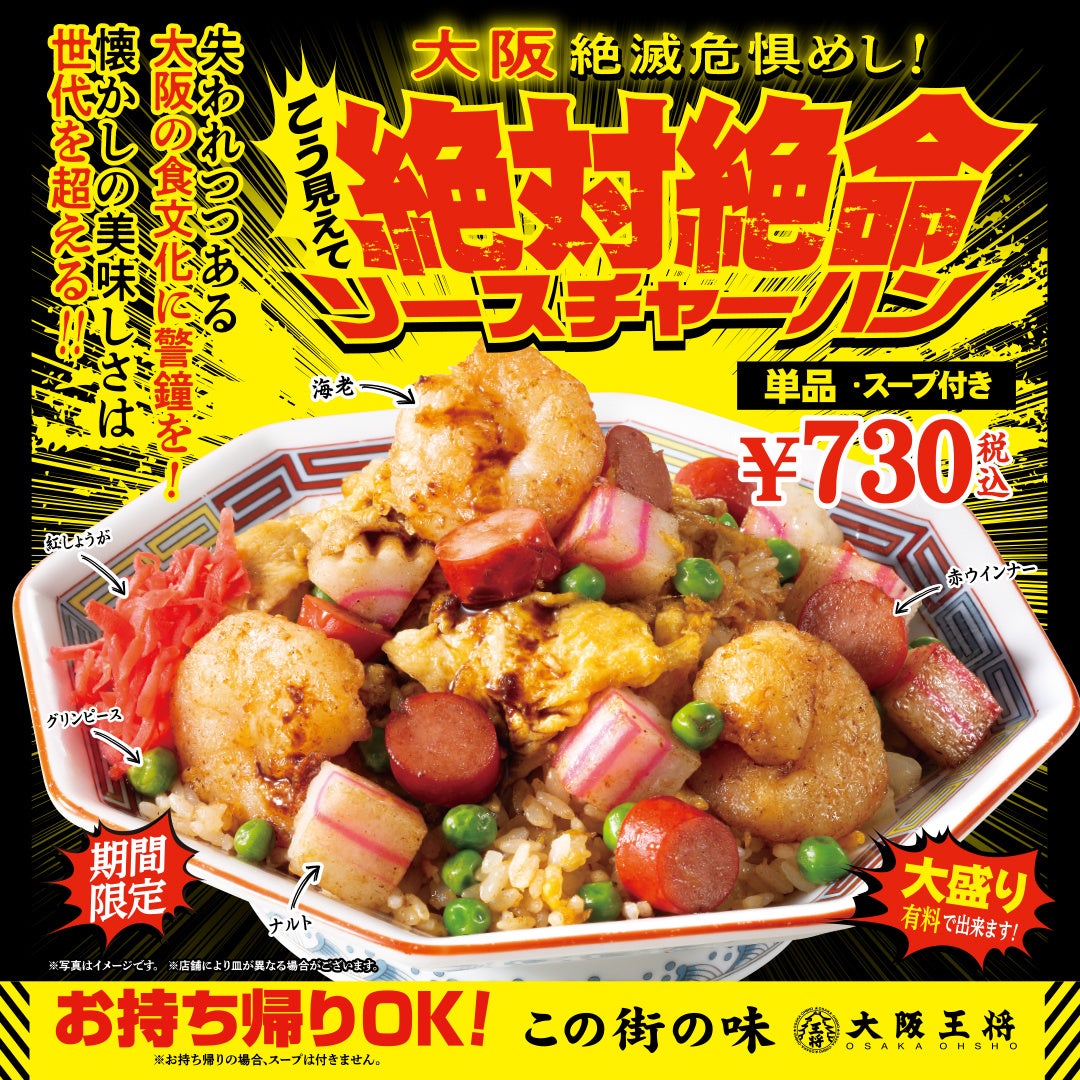 株式会社大阪王将(東京ヘッドオフィス:東京都品川区 代表取締役社長:植月剛)は、餃子専門店「大阪王将」において2022年4月28日(木)より、大阪絶滅危惧めし『絶対絶命ソースチャーハン』を期間限定で販売開始いたします。