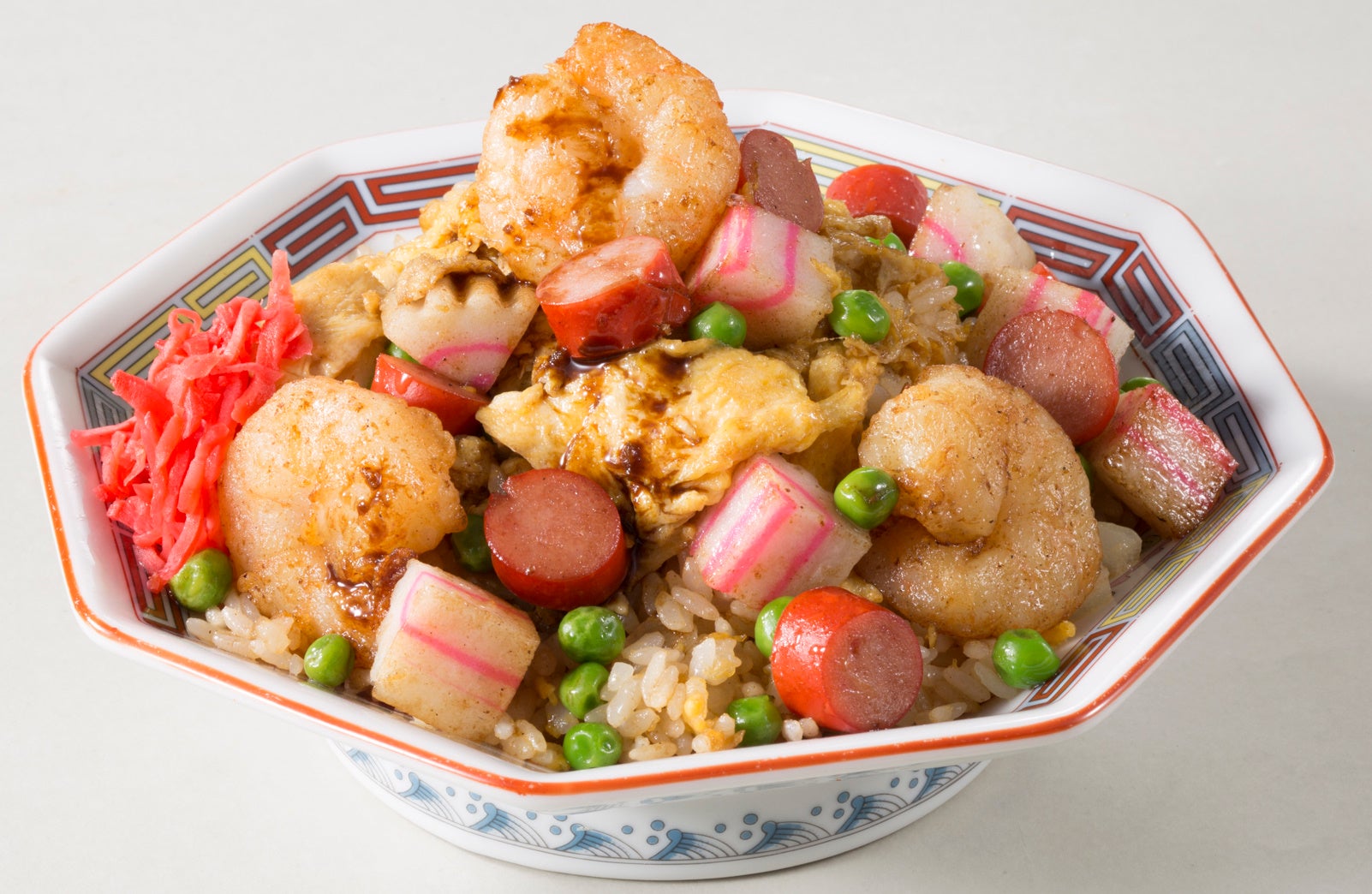 ・商品特徴:大きめにカットされた玉葱の甘みとソースの酸味、にんにくの風味が食欲を誘うウスターソースの香り漂うチャーハンに、ナルト、赤ウィンナー、グリーンピース、ぷりぷりの海老、ゴロゴロ具材がたっぷりのった、食べ応えのある、クセになる一品です。