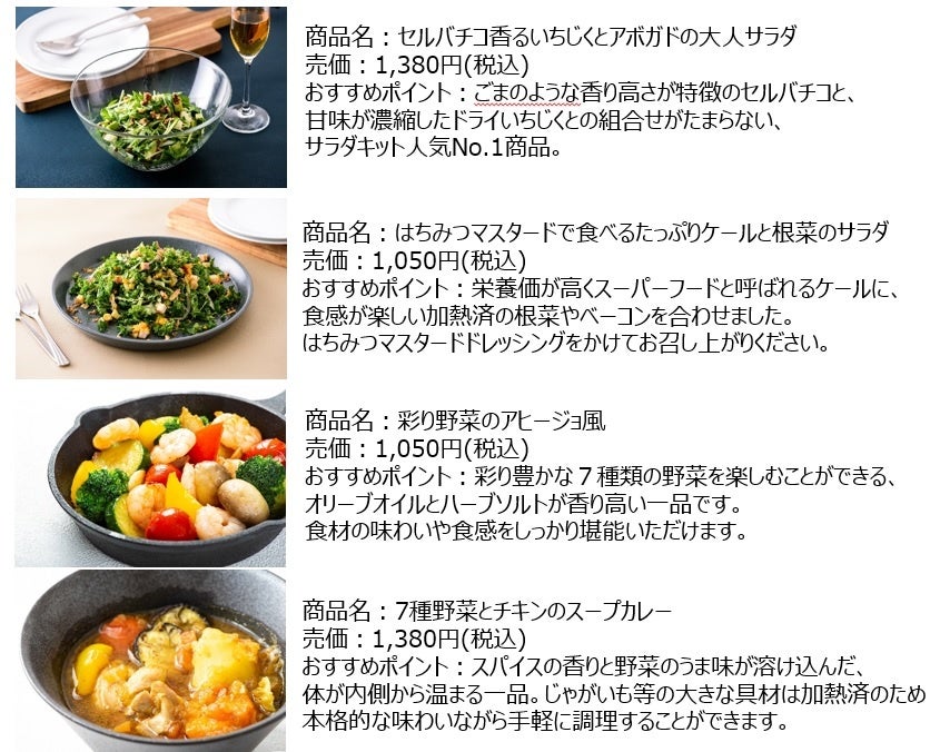 メニューも豊富で「海外料理」「アラカルト」「野菜たっぷりサラダ」「具だくさんスープ」など、毎月10種類の新メニューを発売し、常時20品 を販売予定です。