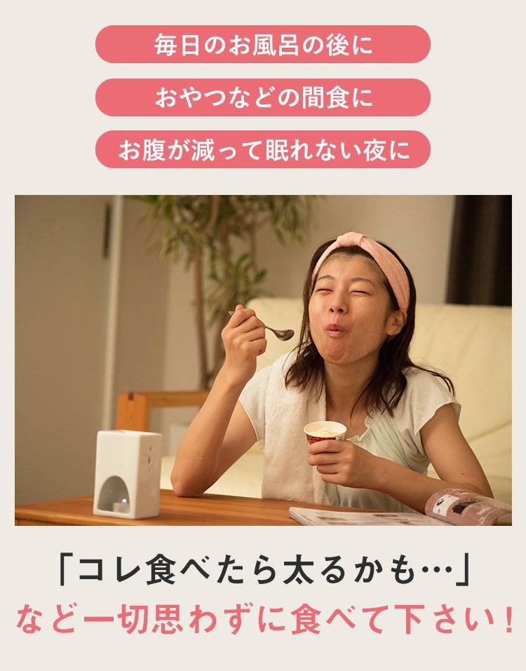 ダイエットをするとなると「食事の量を減らす」ことが特に女性に多く見受けられます。これは「口にするものを減らすことがダイエットに繋がる」といった考え方からくるものだと思いますが、リバウンドを防ぐメリハリボディを創るダイエットにおいては全くおススメできません。筋肉を落とさないように「毎日のお風呂の後に」「おやつなどの間食に」「お腹が空いて眠れない夜に」など様々なシーンで罪悪感なく積極的に食べることを推奨しています。