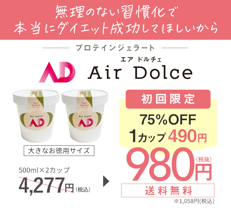 昨年試験的に販売を開始したプロテインジェラートを「AirDolce(エアドルチェ)」に名称変更すると共に初回お徳用サイズ500ml2カップ税込1,058円(1カップ税込529円)と大変お求めやすい価格でサブスク型に変更させていただきました。