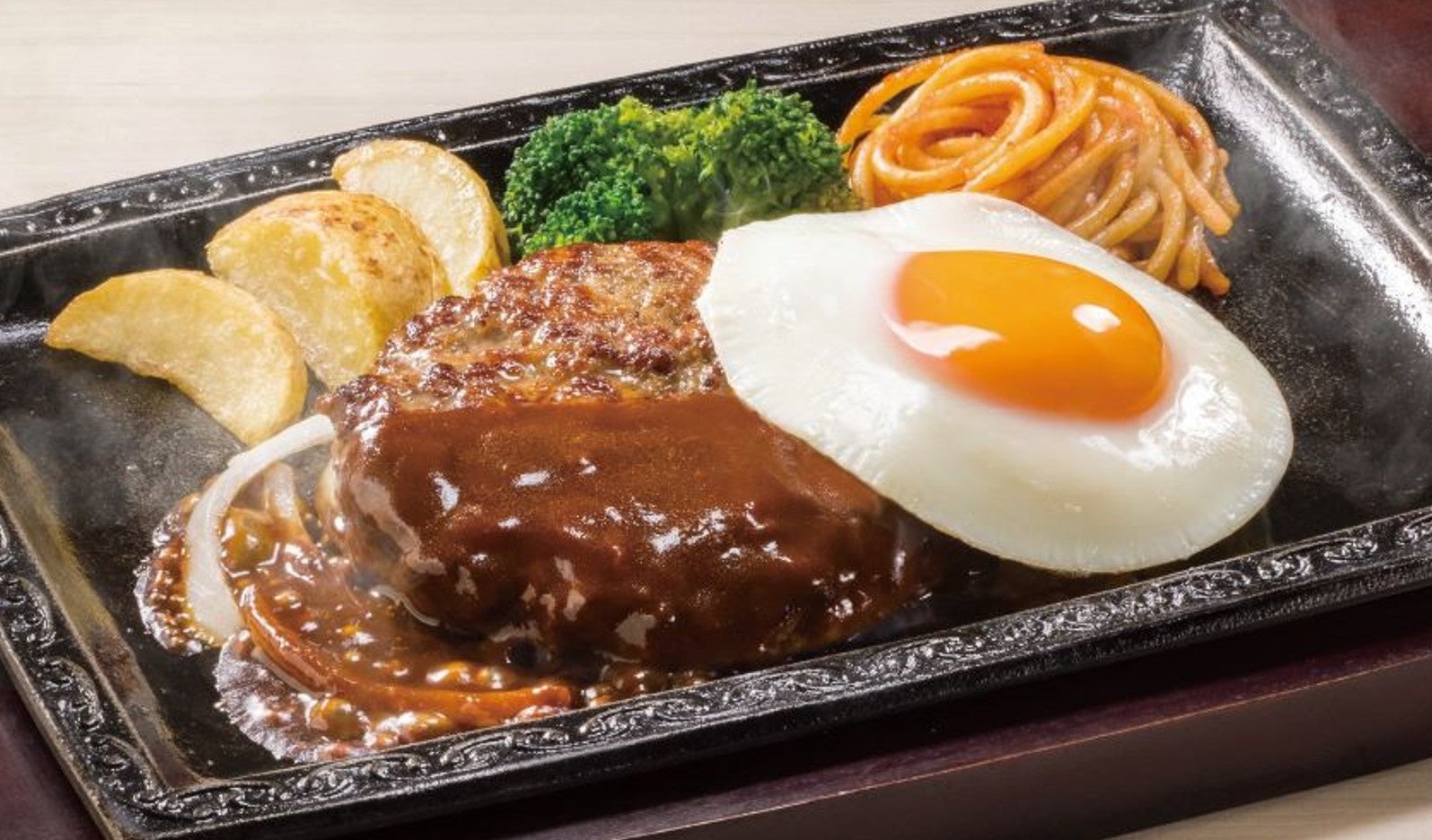 ハンバーグの製法、肉の配合率を追求し、今まで以上にふっくらジューシーな仕上がりを実現。さらに、ボリュームもアップ。付け合わせにブロッコリーとナポリタンを追加し、食べ応えのある一皿に生まれ変わりました。