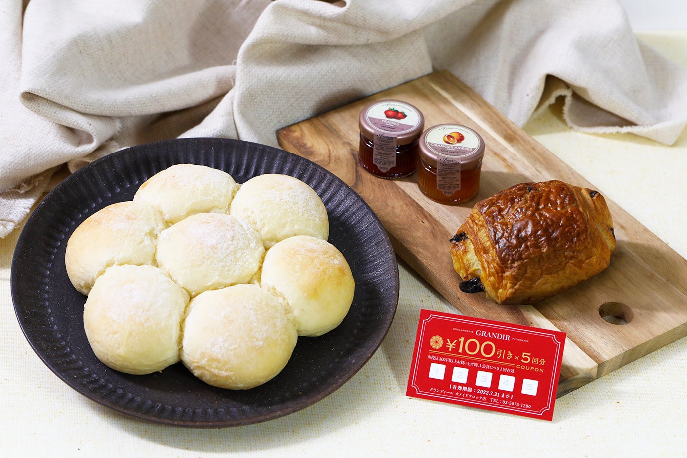 ・内容:京生ちぎりパン〜プレーン〜 1個、パン・オ・ショコラ1個、ジャム2種類 各1個、500円分のパスポート1枚(100円引き×5回分)をセットにいたしました。