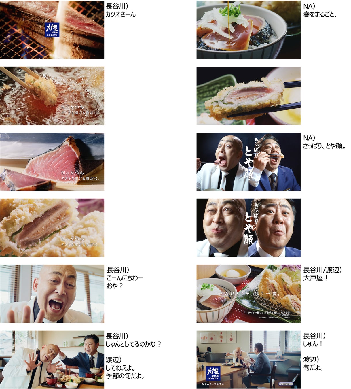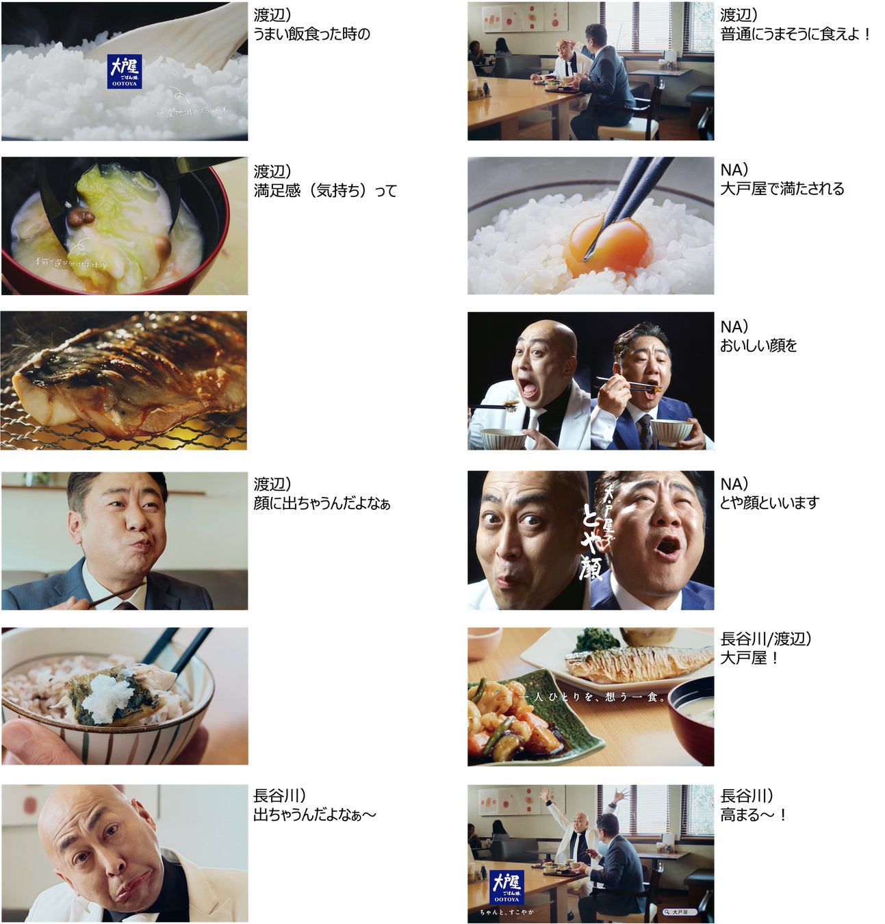 今回のCMのコンセプトは、 「一人ひとりを、想う一食。」。CM内では大戸屋のご飯を食べて満たされている顔を「とや顔」と名付け、錦鯉のお二人に様々な「とや顔」を表現していただきました。ご飯を食べた後の美味しそうな「とや顔」、旬のカツオを食べてさっぱりした「とや顔」。お二人の豊かな表情や、CM内で見せる長谷川さんの顔芸・長谷川さんのボケに対する渡辺さんのキレのあるツッコミなど、漫才さながらのコミカルなやりとりにも是非ご注目ください。