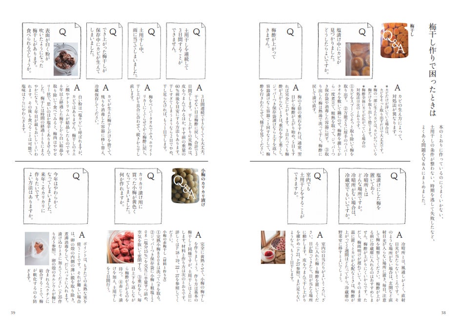 困ったときのQ&Aまで網羅。土用干しができるような庭がない場合、晴天が続かなかった場合など、現代の梅干し作りならではの疑問も解消できます。