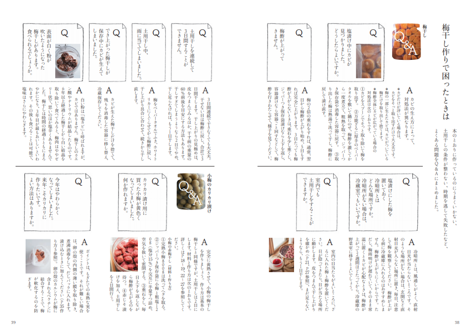 困ったときのQ&Aまで網羅。土用干しができるような庭がない場合、晴天が続かなかった場合など、現代の梅干し作りならではの疑問も解消できます。