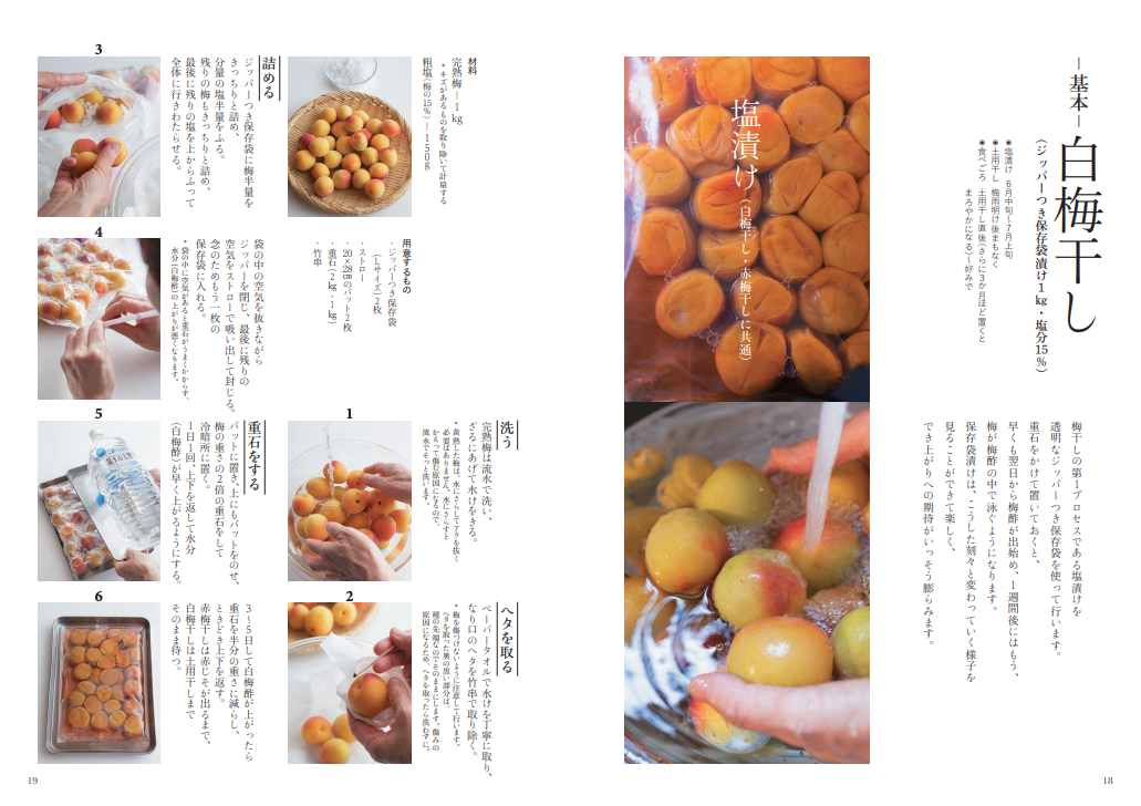 ジッパーつき保存袋で500gや1kgの少量から気軽に作れる梅干し作りをはじめ、減塩梅干し、はちみつ入り梅干し、小梅のカリカリ漬け。さらに梅酒、梅シロップ、ジャムやコンポート、梅肉エキスなど。様々な梅しごとを丁寧なプロセス写真とともに詳しく解説しています。