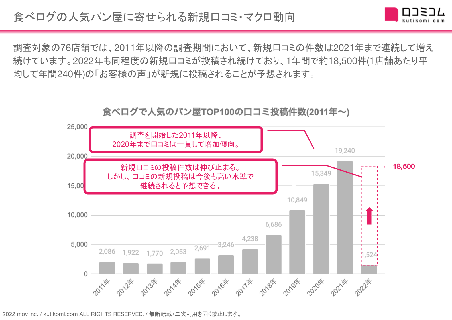 2022年は、1年間で約18,500件、1店舗当たり平均年間240件の口コミが寄せられると予想されます。