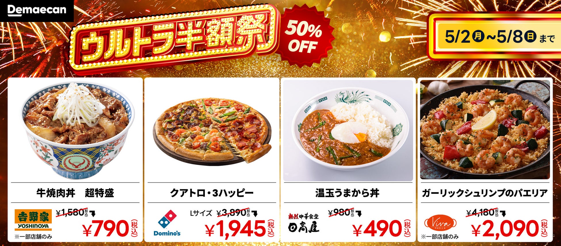 弁当、中華、洋食、ピザなどの対象商品を、通常価格より50%OFFでご提供