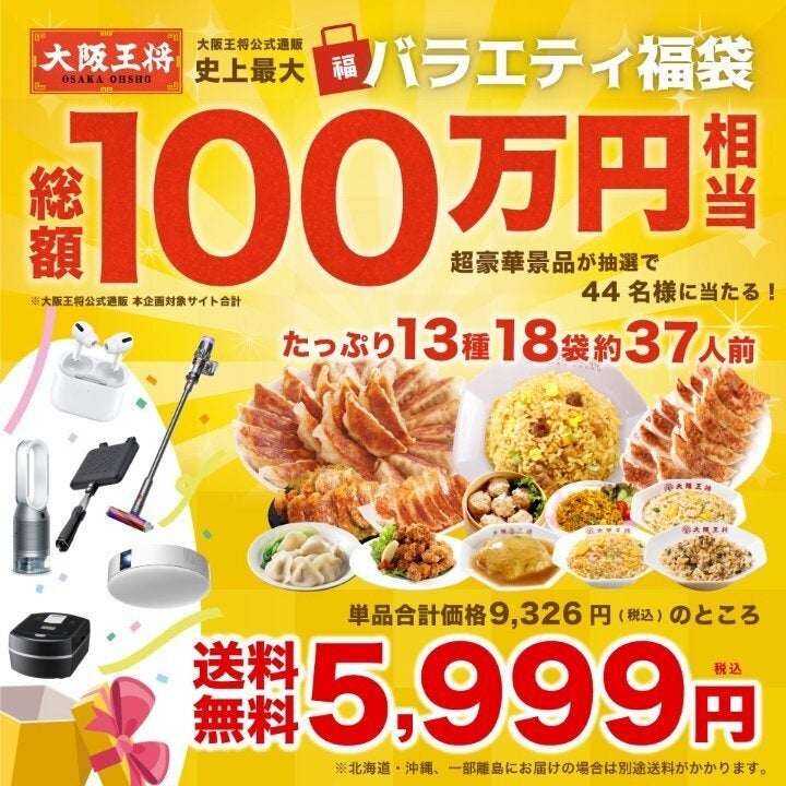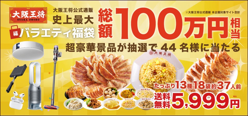 「お客様還元バラエティ福袋」は、大阪王将公式通販サイトで本商品をご購入いただくだけで、抽選で44名の方に超豪華景品が当たります。大阪王将公式通販サイト本店の他、楽天店、PayPayモール店、dショッピング店など本商品取扱い店舗でのご購入で、抽選にご参加いただけます。餃子や炒飯など、大阪王将の人気商品がたっぷり13種18袋も入った充実のラインナップは、福袋の中身だけでもお値段以上の価値あり。大阪王将自慢の中華でおなかいっぱいの幸せを。詳細は、下記ページにてご確認ください。