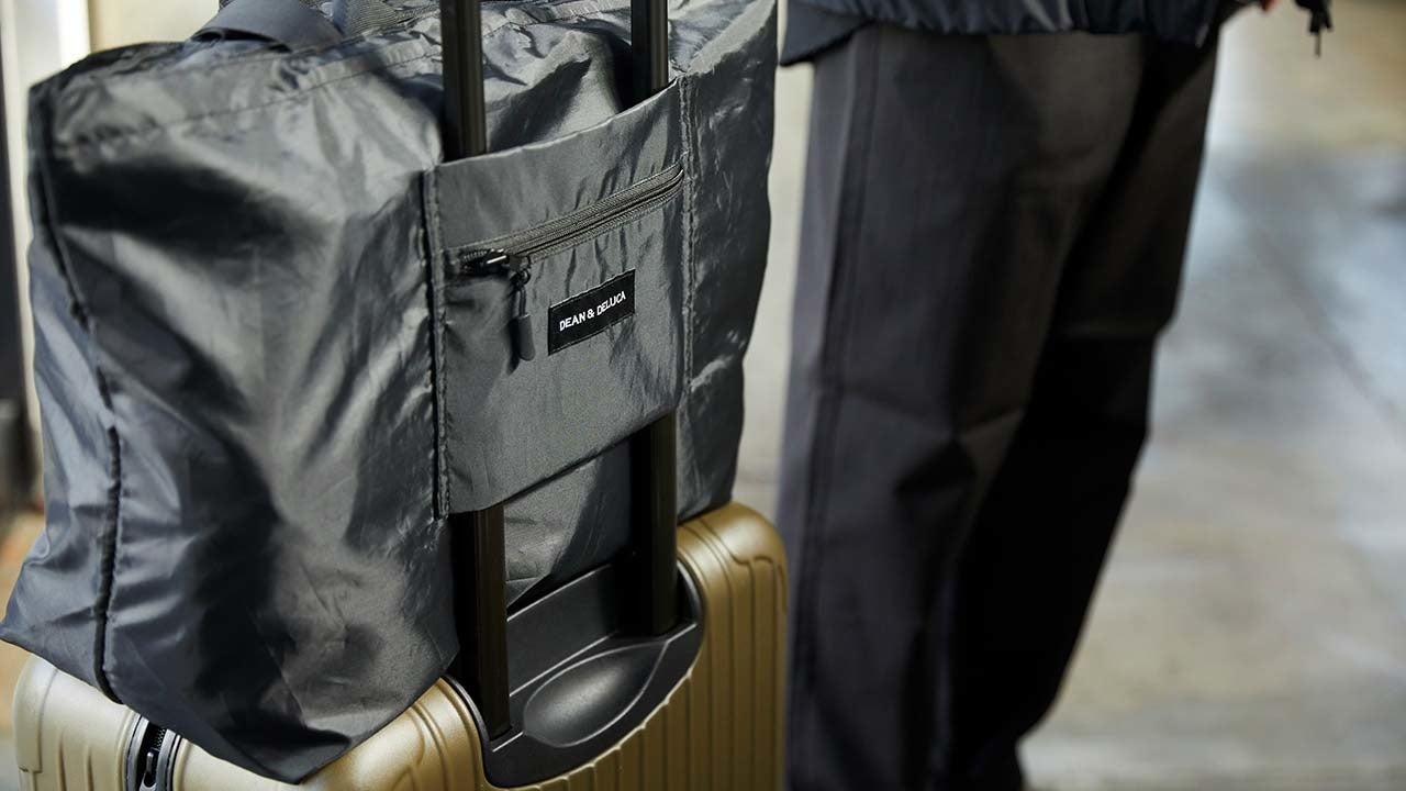 バッグの背面にはスーツケースのキャリーバーに装着できるスリーブ付き。重い荷物の移動も楽になり、荷物の置き忘れや、ズレ落ちも防ぎます。また、軽量コンパクトに折り畳むことができるので、持ち運びに便利。