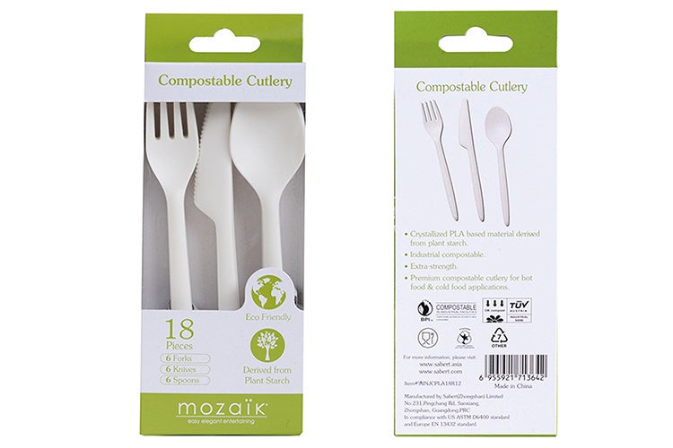 PLAプラ(植物由来)とタルク素材の環境配慮型カトラリー。完全包装、可燃ゴミとして廃棄可能。