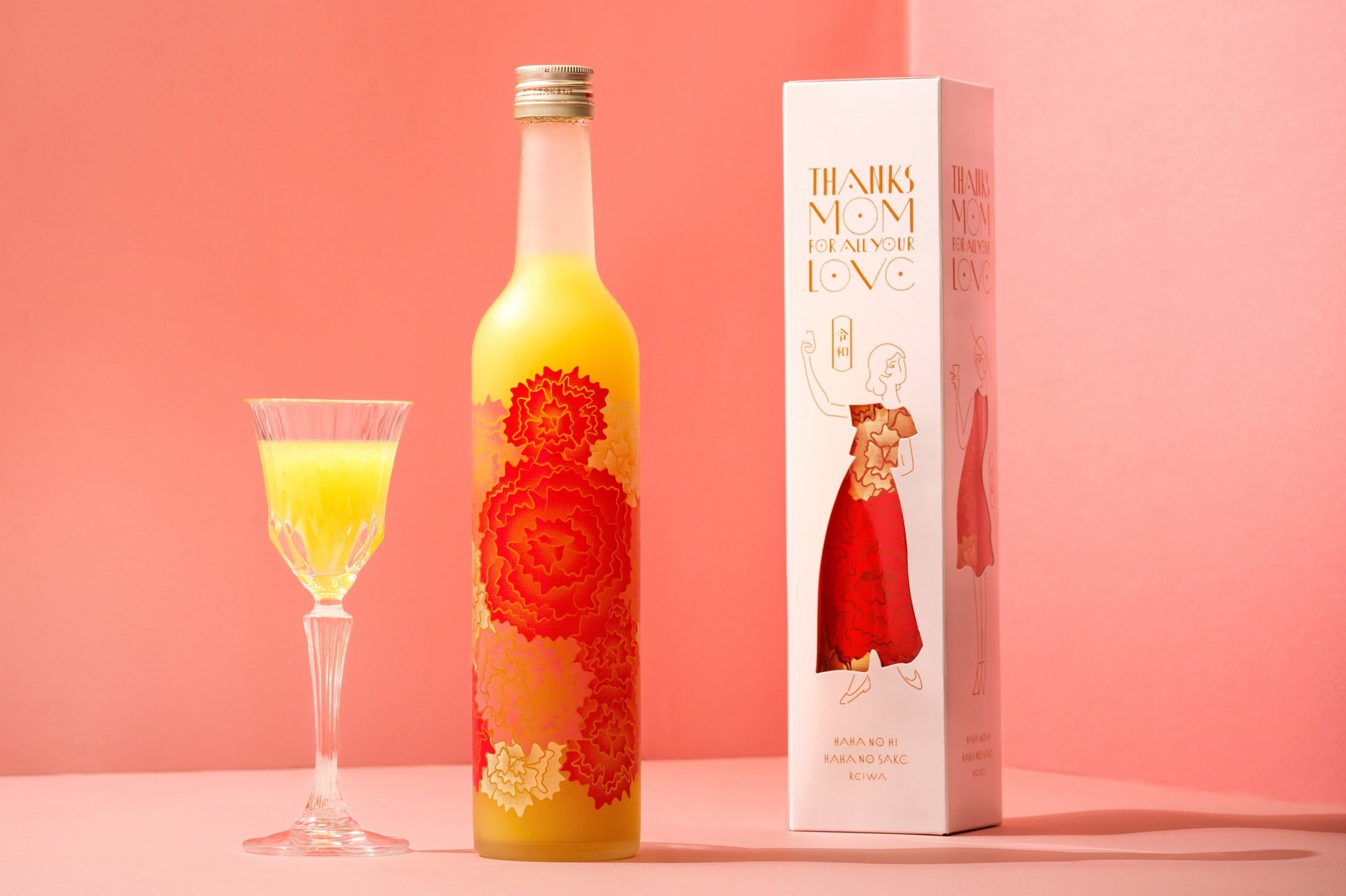 母の日限定ギフトボックスの3面には花柄の洋服を着た「昭和・平成・令和の3世代のお母さん」が現れる、母の日にピッタリなギフト商品です。お母さんの服の部分だけ切り抜いているので、化粧箱の中でボトルを回転させることによって、お母さんの着ている服の花柄の模様が少しずつ変化する仕掛けになっています。どこから見ても楽しい、飲んで美味しいギフトです。