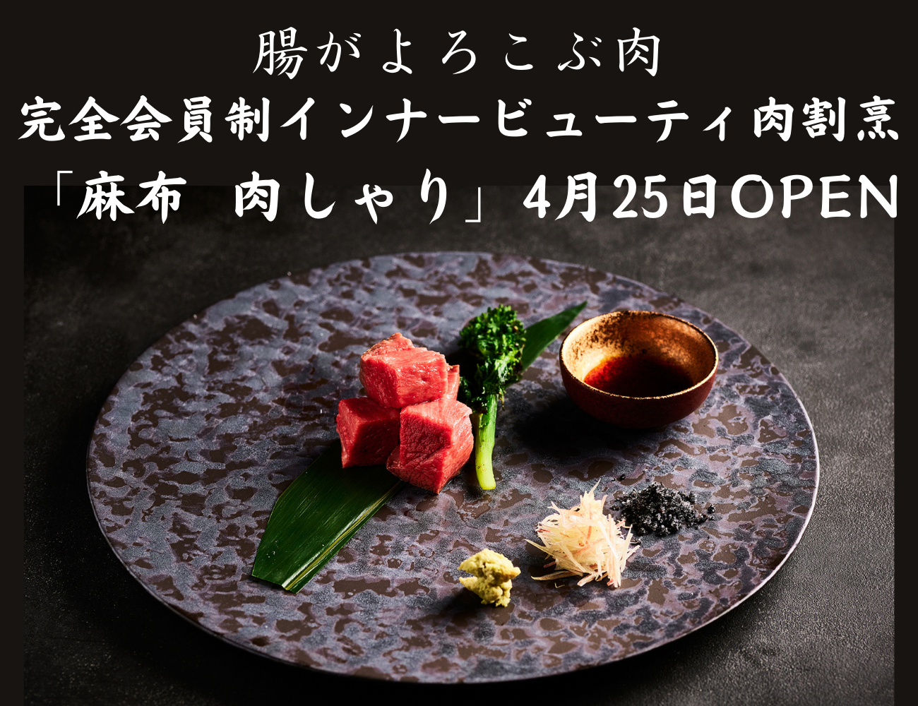 インナービューティブランド「エステプロ・ラボ」を、世界15か国に展開する株式会社プロラボホールディングス(所在地:東京都港区、代表取締役 兼 CEO:佐々木 広行、以下 当社)は、“腸がよろこぶ肉”をコンセプトに、「抗生物質・ホルモン剤を使用しない安全でヘルシーな肉」を提供する完全会員制の世界初インナービューティ肉割烹『麻布 肉しゃり』を、2022年4月25日(月)東京・麻布十番にオープンいたします。