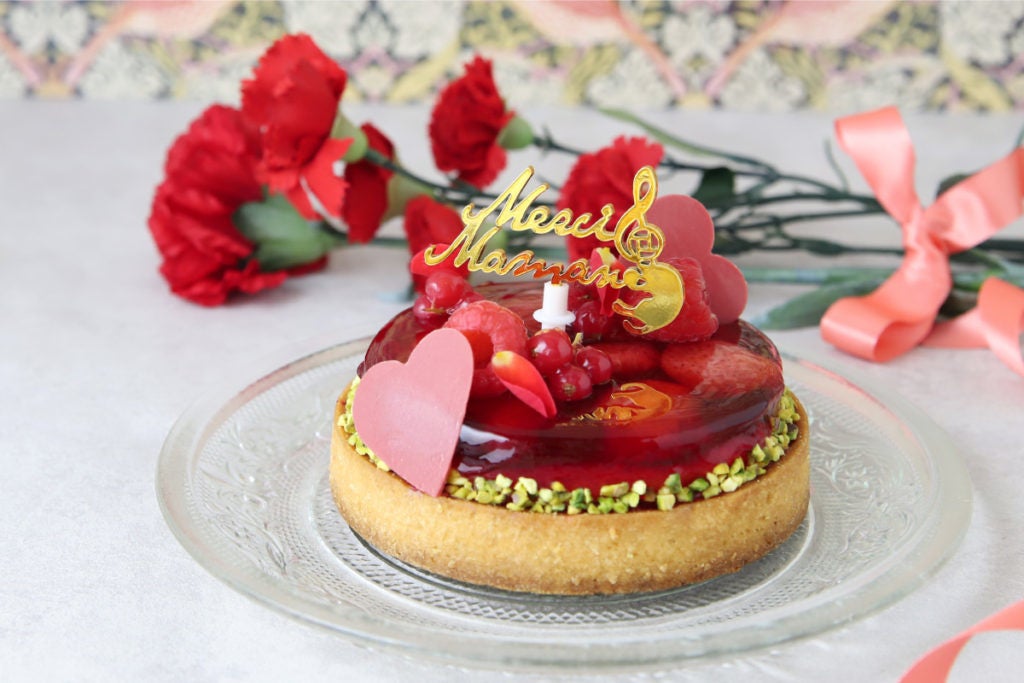 トゥーストゥースを代表するフルーツタルト、「タルトフレーズ」をお取り寄せしていただけるよう、艶やかなあまおう苺のジュレタルトに仕上げました。「母の日」の季節限定ケーキは、『お母さん、いつもありがとう』のメッセージを添えたオリジナルピック付きでご用意しました。