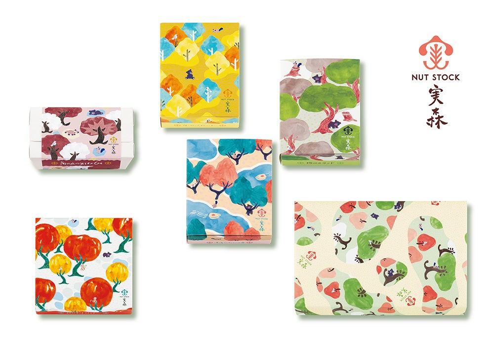 「実森」のギフトパッケージは、ふしぎなムードをただよわせる「実森」の森を水彩画タッチで幻想的に描いたデザインコレクションです。それぞれのお菓子が実る木は、色も形も様々。たいせつな実を守るようにそこかしこに隠れているのは小さな動物たち。可愛い姿を見つけるとほっこりと幸せな気持ちになってしまいます。