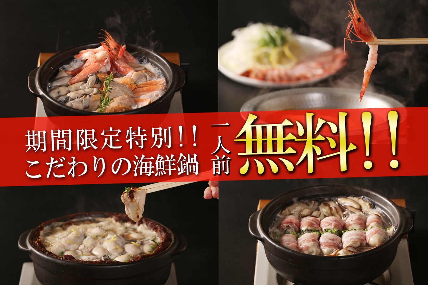 2022年4月21日メニューリニューアルを記念して、産直牡蠣やあん肝、南蛮海老などのこだわりの食材を使用した4つの海鮮鍋を1人前無料でご提供いたします。