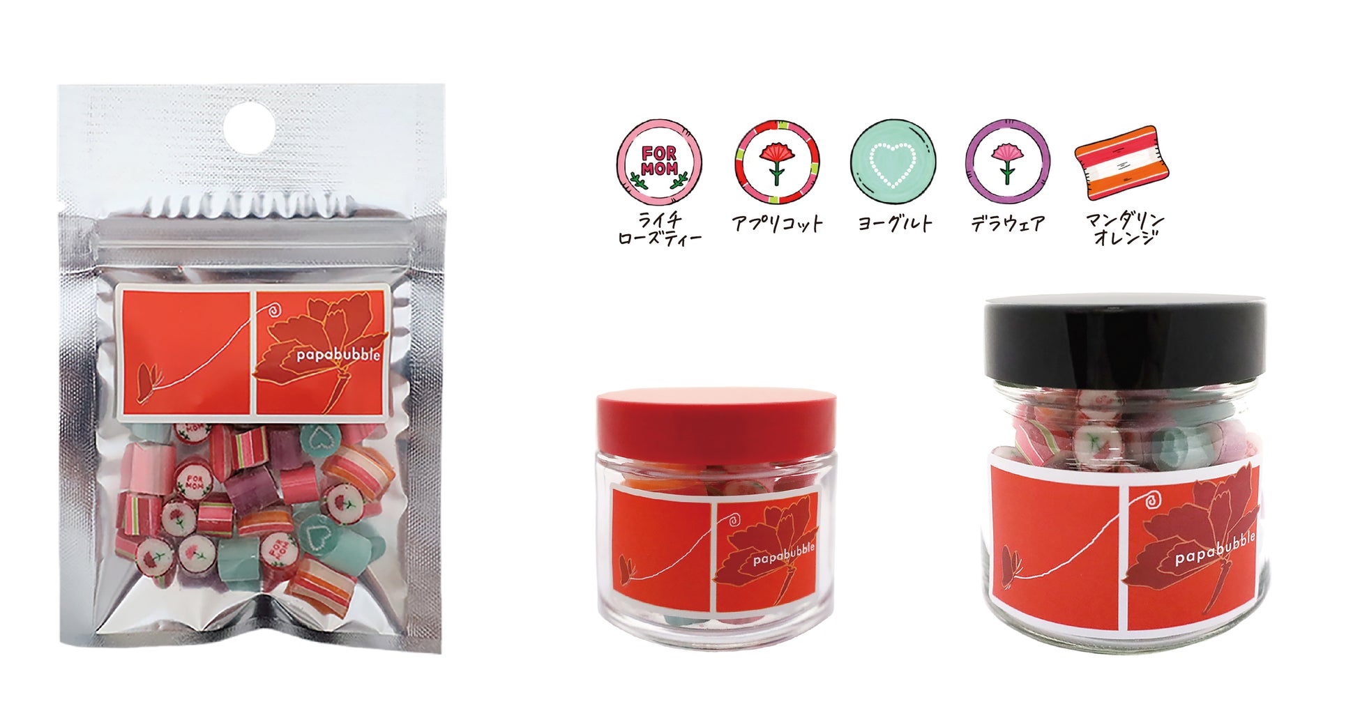 いつものバッグ入りキャンディには、母の日限定デザインを数量限定でご用意。