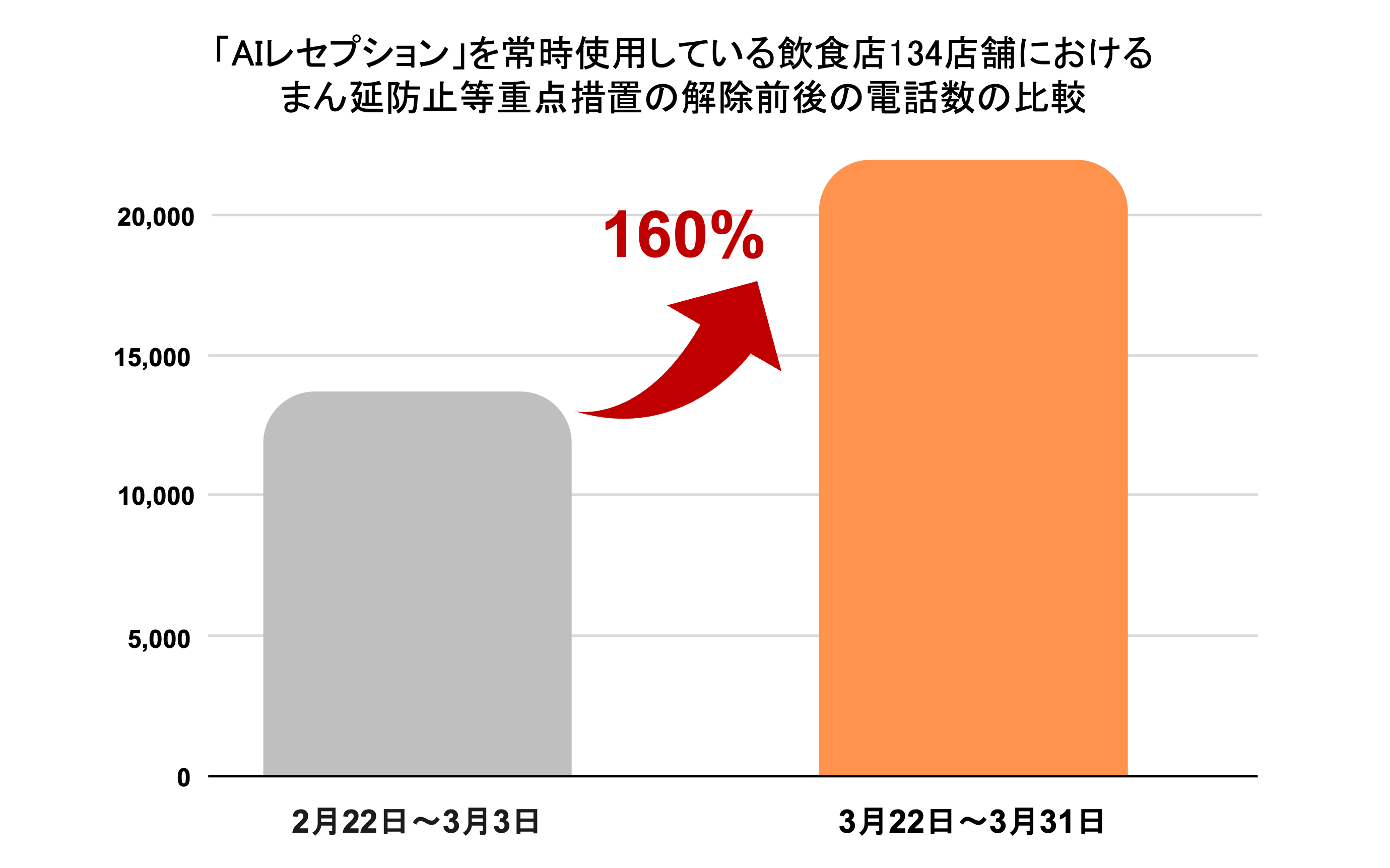 ※1:AI電話予約応対サービス「AIレセプション」を常時使用している飲食店における、まん延防止等重点措置の解除前10日間と解除後10日間の電話数の比較