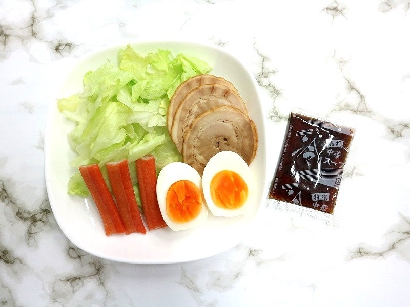 冷やし中華 醤油だれ(1人前)/VLカットレタス(1/2袋)/チャーシュー(3枚)/VLツインパックスティック(2~3本)/ゆでたまご(1個)/紅しょうが(お好みで)