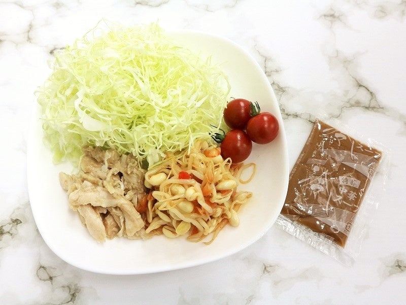 冷やし中華 ごまだれ(1人前)/VLキャベツ千切り(1/2袋)/サラダチキン(1パック)/VLきざみオクラ(お好みの量)/キムチもやし(お好みの量)/ミニトマト(2~3個)
