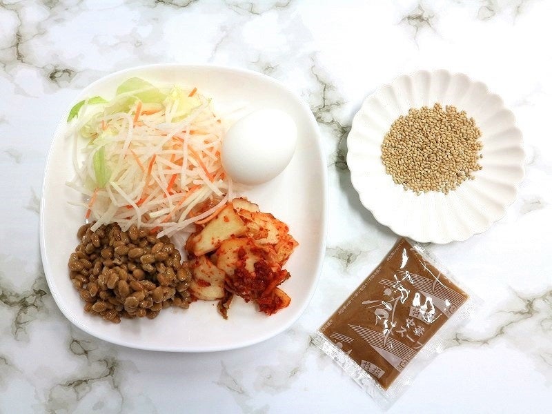 冷やし中華 ごまだれ(1人前)/VL大根サラダ(1/2袋)/VLルーさんの甘辛キムチ(お好み量)/VLとろり半熟トッピングたまご(1個)/納豆(1パック)/VLいりごま 白(ひとつまみ)