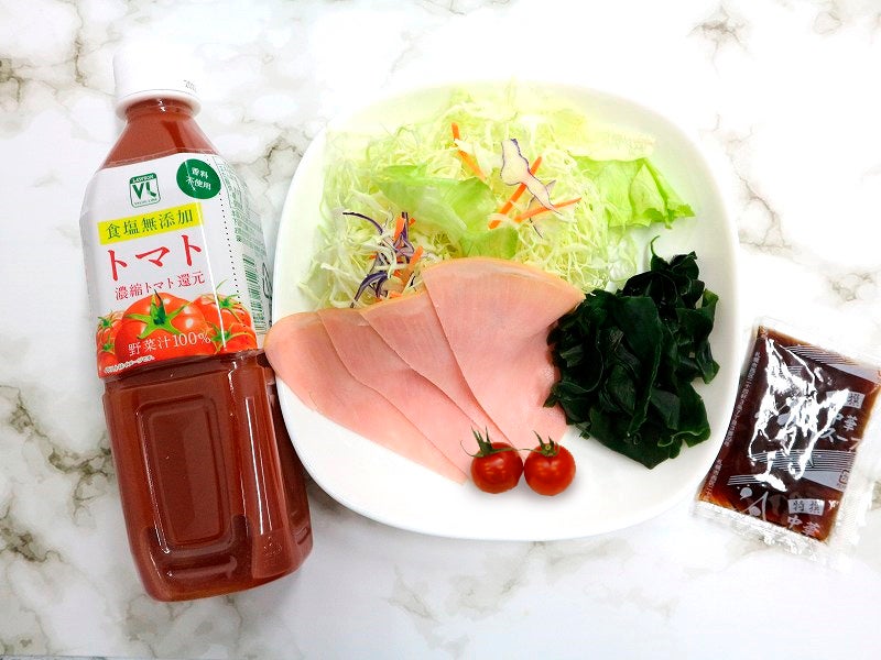冷やし中華 醤油だれ(1人前)/VL食塩無添加トマトジュース(200ml)/VLミックスサラダ(1/2袋)/VLロースハム大判(2~3枚)/VLカットわかめ(お好み量)/ミニトマト(2~3個)