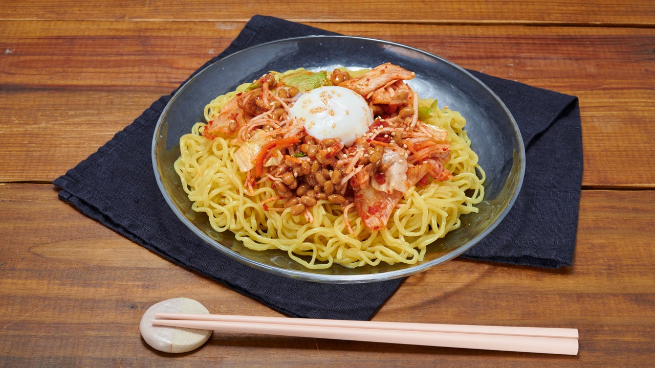 気温が上昇するにつれて、ガツンとパンチの効いたメニューが欲しくなることもありますよね。続いてのアレンジレシピは、スタミナばっちりの「キムチ納豆冷やし中華」です。